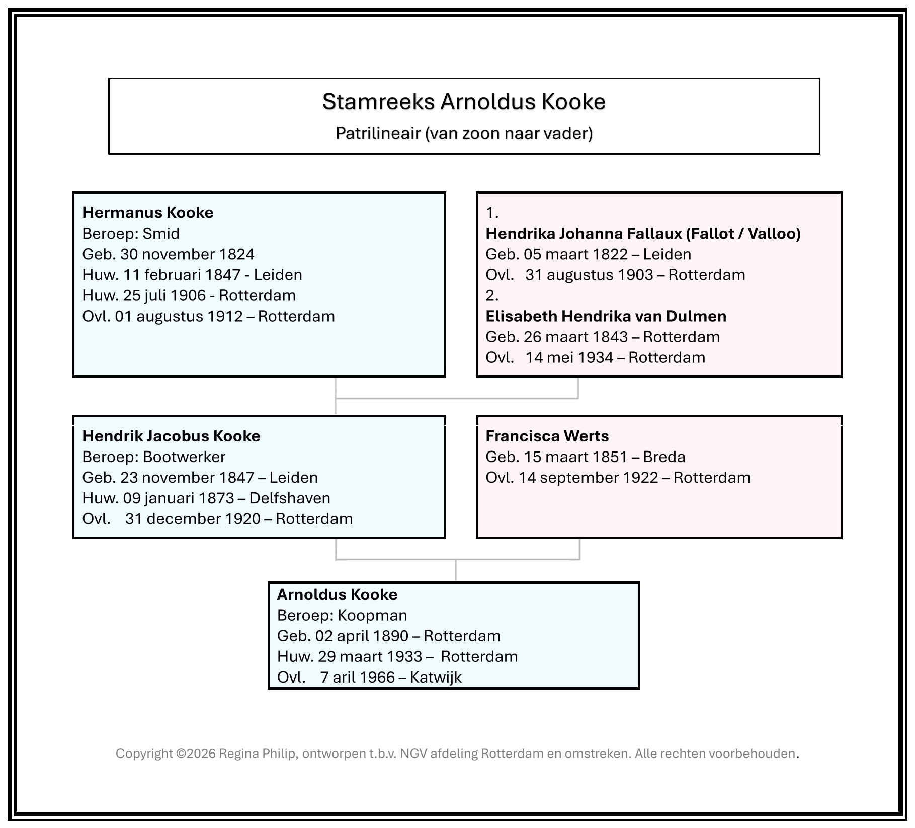 Mijn onderzoek naar de familie Kooke gaat terug tot begin 1700. In vaderlijke lijn gaat de stamreeks van mijn grootvader Arnoldus Kooke slechts 2 generaties terug. Zijn overgrootmoeder Margaretha Kooke (Amsterdam, ± 1783 – Leiden, 1844) was gehuwd met Tieleman van den Berg die overleed op 13 januari 1822 in Leiden. Na zijn overlijden krijgt Margaretha nog 2 kinderen. Wie de vader van deze kinderen is, blijft nog steeds een mysterie. Arnoldus krijgt een relatie met mijn grootmoeder, de weduwe Sophia van Dam (Groningen, 29 oktober 1894 – Rotterdam, 27 mei 1977) die reeds 2 kinderen heeft uit haar eerste huwelijk. Samen krijgen ze nog 6 kinderen. Opvallend is dat ze pas na de geboorte van hun 5e kind op 29 maart 1933 in Rotterdam in het huwelijk treden. De reden van dit late huwelijk is mysterie nummer twee en de hoop is dat hier ooit een antwoord op komt. Arnoldus verkocht vanuit een houten handkar op het Kruisplein in Rotterdam fruit, zure bommen en snoep.